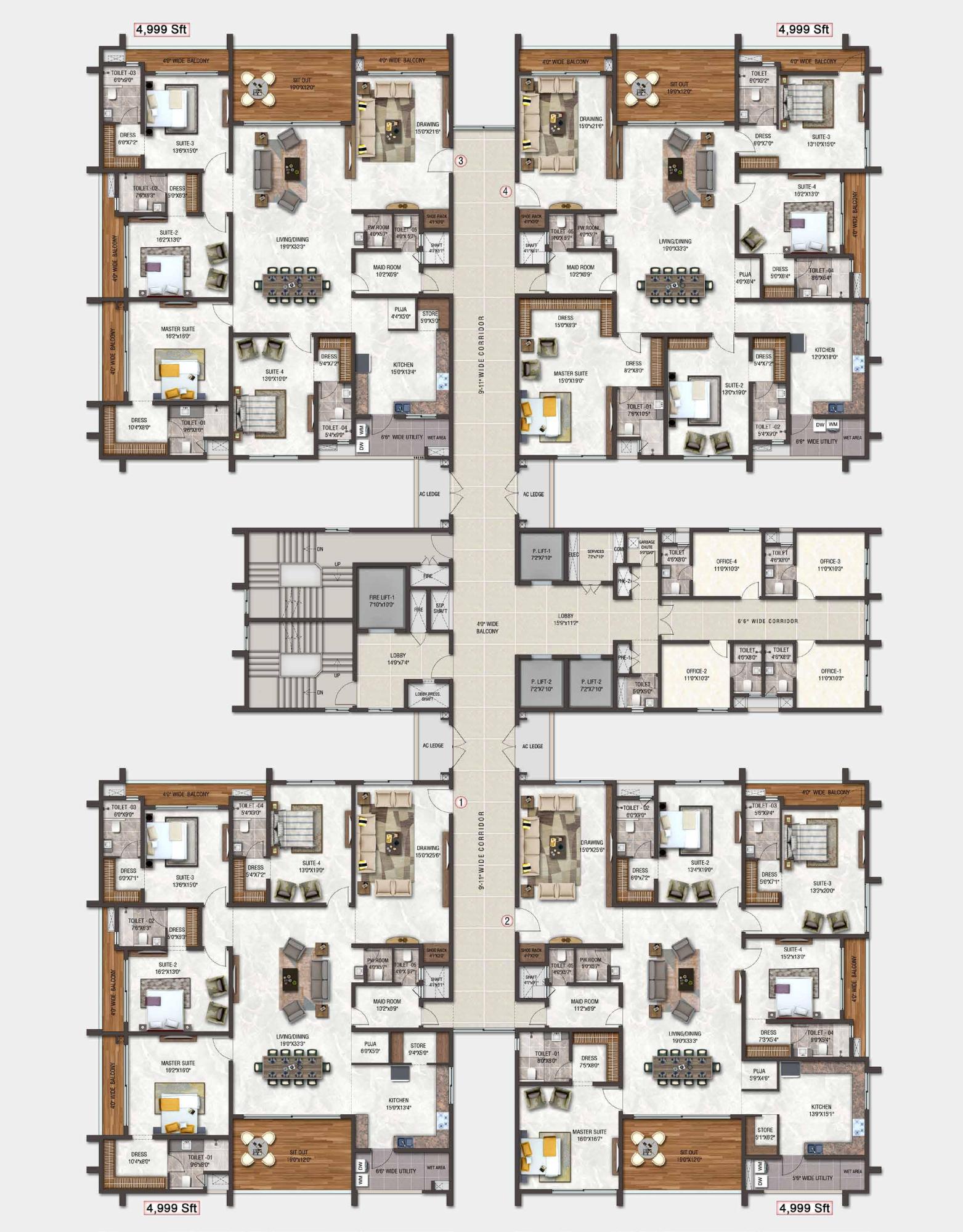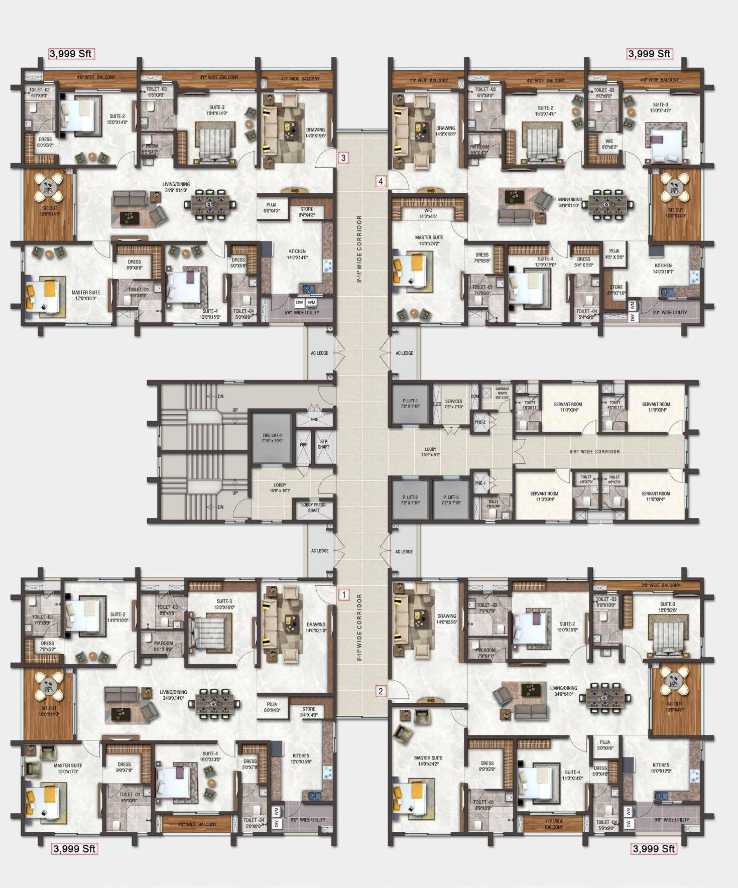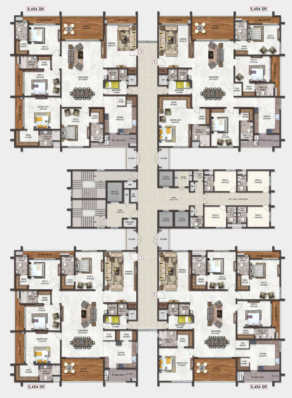 A: It offers large 4 BHK apartments ranging from 3999 sq. ft. to 5454 sq. ft.