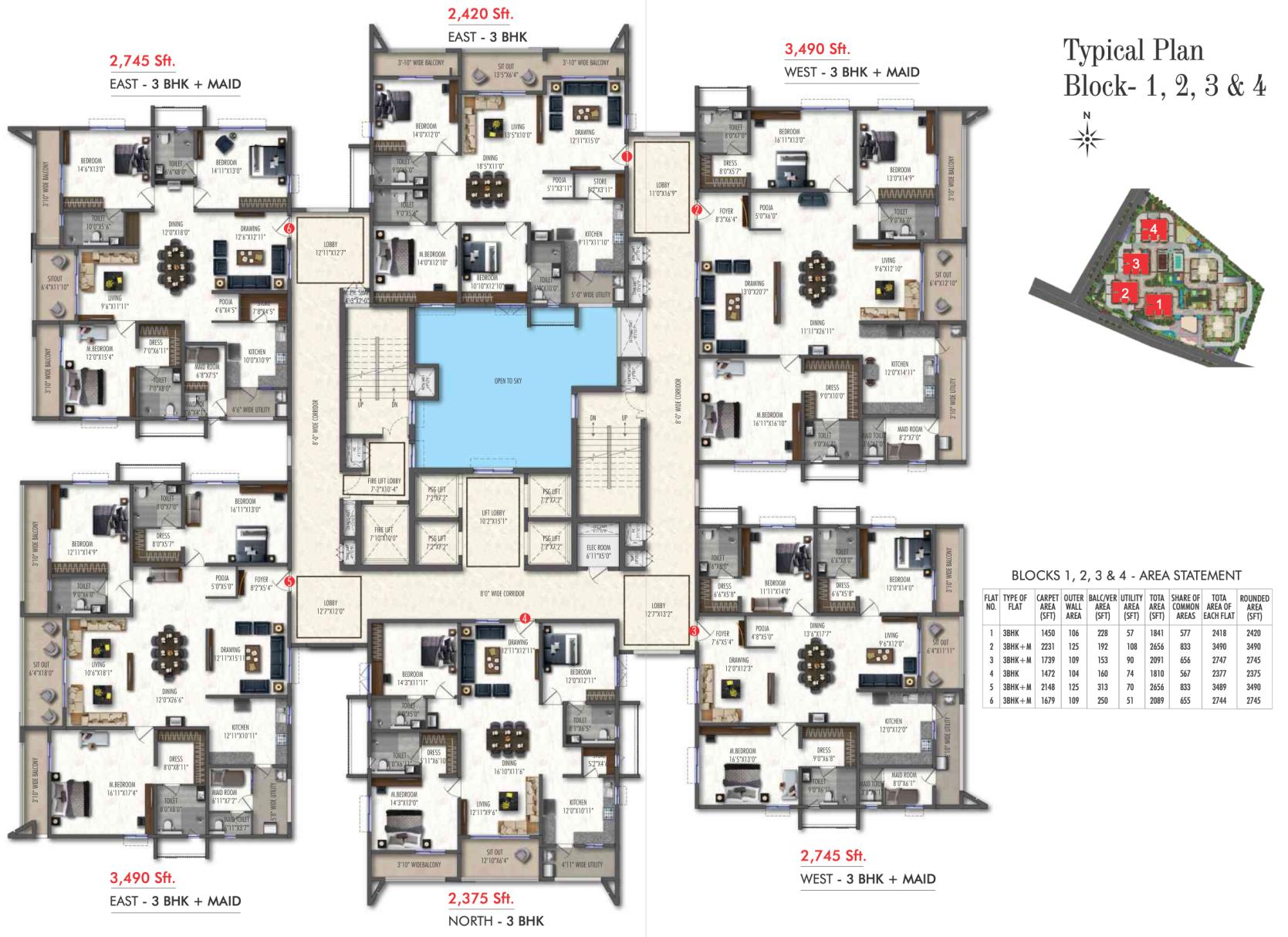 No. Type Carpet Area (in Sft) Outer Wall Area (in Sft) Balcony Area (in Sft) Utility Area (in Sft) Area (in Sft) Share of Common Areas (in Sft) Total Area of Each Flat (in Sft) Tot. Area (in Sft) 1 3BHK 1450 106 228 57 1841 577 2418 2420 2 3BHK+M 2231 125 192 108 2656 833 3490 3490 3 3BHK+M 1739 109 153 90 2091 656 2747 2745 4 3BHK 1472 104 160 74 1810 567 2377 2375 5 3BHK+M 2148 125 313 70 2656 833 3489 3490 6 3BHK+M 1679 109 250 51 2089 655 2744 2745 BLOCKS 5, 6 & 7 - AREA STATEMENT